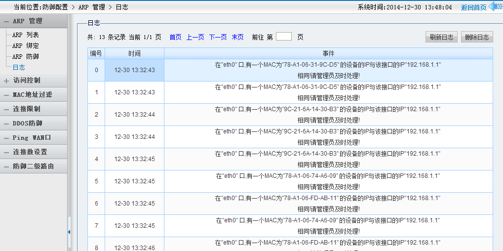 当路由器出现‘某个MAC地址的设备与路由器的IP地址相同!请管理员及时处理!’错误时(如下图所示),是下面设备与路由器的IP地址想冲突信息。