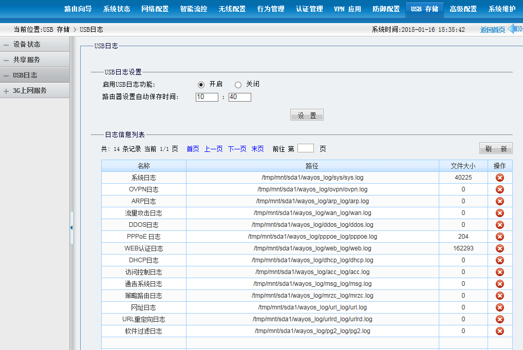 2、在USB日志中,点击’开启‘启用USB日志功能;并设置好保存时间。如下图