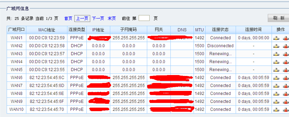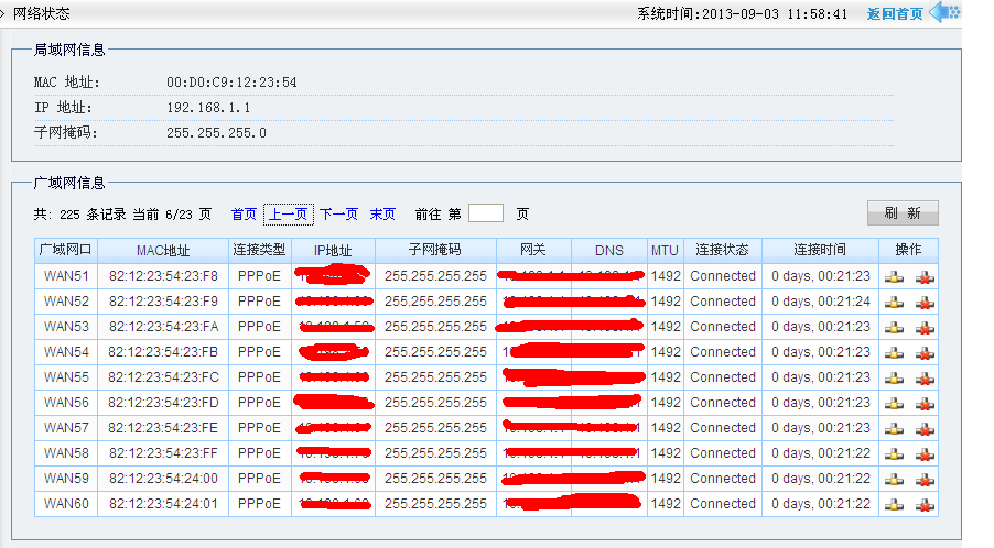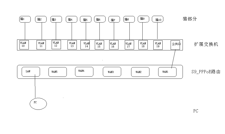 环境:使用S9_PPPoE路由器。授权WAN口数量240个。10个电信猫,一个电信猫可以支持20拨。一台扩wan交换机。