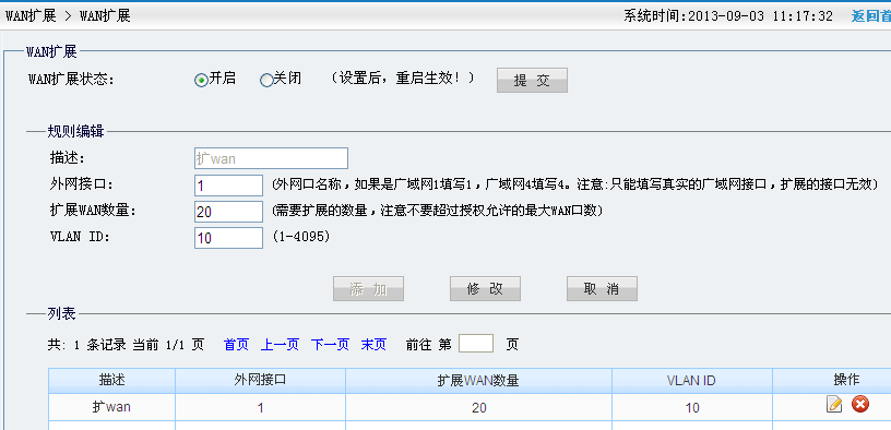 设置路由器。使用广域网1进行扩wan。现在是只有10个猫,因以后还要扩展拓展线路或者有其他的规划,现在设置扩wan数量为20个。VLAN ID从10开始。以上图图1我们交换机的扩展VLANID进行配置,以相互对应。设置好之后重启路由器。配置如下图(图2)
