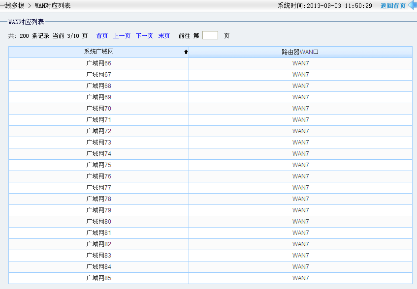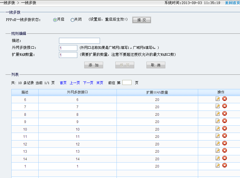 通过上面的设置,我们可以每一个猫拨号一次。但是要求是需要一个猫拨号10次。那么现在就需要使用到一线多拨功能。使用扩展的广域网1、6、7、8、9、10、11、12、13、14做一线多拨。每一个广域网拨号20次(图5)
