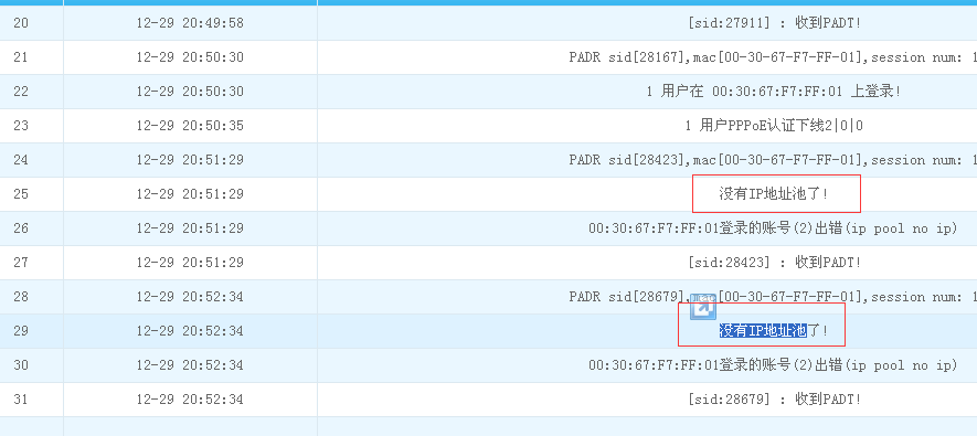 已经确认用户名密码是正常的,但是在pppoe日志查看到,“没有IP地址池了”。