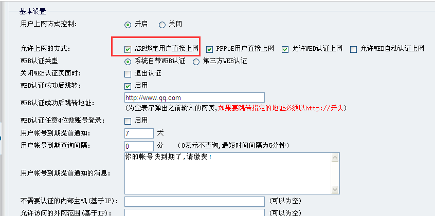 2、绑定之后,在认证管理 > 基本设置 再选择ARP绑定直接上网认证方式即可。
