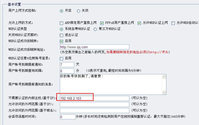 2、在在认证管理 > 基本设置 不需要认证的内部主机(基于IP),填写上管理员绑定的IP。