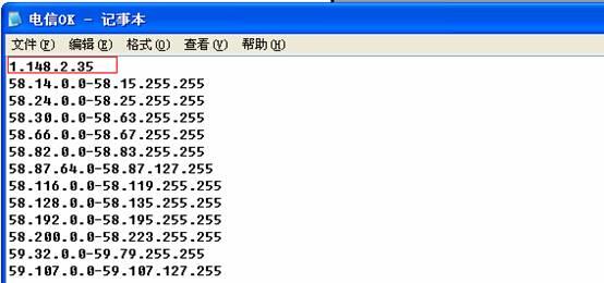 2.那么把电信网通的地址下载下来检查(下载地址:策略路由--地址范围,下载后的文件可以直接使用记事本的方式打开),这个IP地址是不是包括在电信网通的地址里面;如果IP地址包括在网通地址里面了,那么可以把这一条地址删除,然后在电信地址中添加进去。