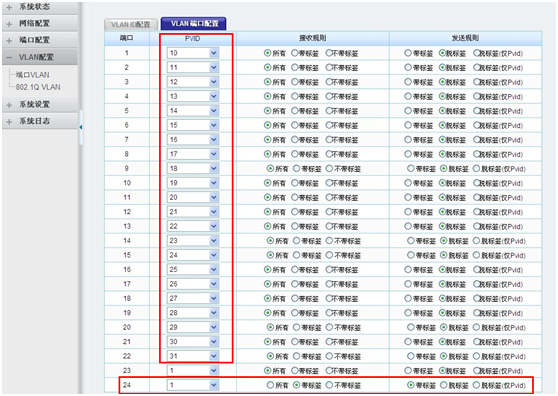 备注:公共口的设置与其他口不同,需全部选择‘带标签’。(公共口即交换机的网口直接路由器的广域网相连)