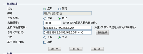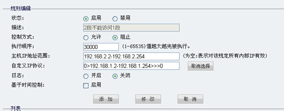 例如,设置1段和2段不能互访,我们需要做两条规则,一条是1段不能访问2段,另一条是2段不能访问1段。