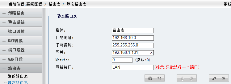此处测试,一级路由的LAN口的IP地址是192.168.1.1/255.255.255.0,二级路由WAN口的静态IP是192.168.1.101/255.255.255.0。二级路由LAN口的IP地址是192.168.10.1/255.255.255.0。 在一级路由器中添加的静态路由表规则如下图2所示: