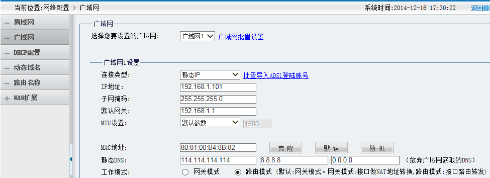 然后在二级路由中,要做路由模式的WAN口设置中,把工作模式改成路由模式即可。如下图3所示: