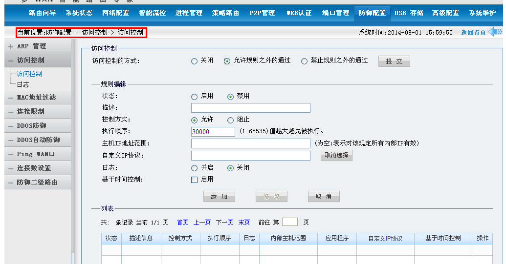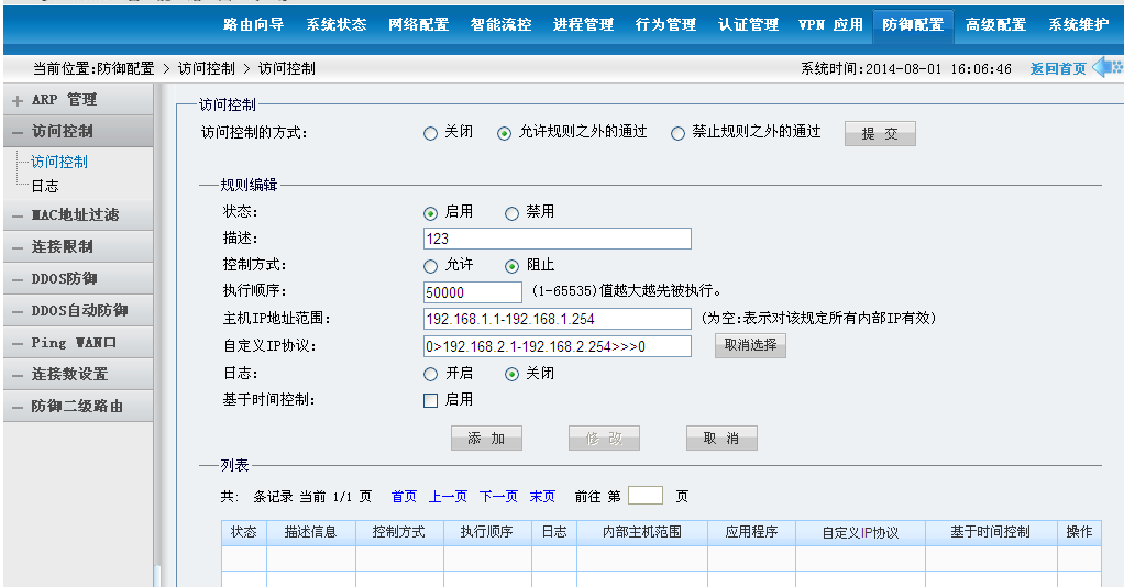 假设路由器上划分了两个网段分别是192.168.1.1,和192.168.2.1。如何做到让这两个IP段下面的用户不能互访呢!这个时候你打开路由器配置界面找到防御配置的访问控制。