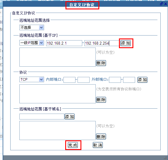 自定义IP协议:在远端地址范围出填上192.168.2.1-192.168.2.254