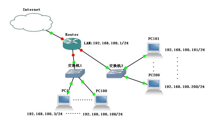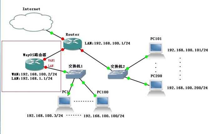 上图的结构中,该网络所使用的网段为192.168.100.0/24.现在把WayOS路由接到”交换机1”的前面,WAN1接入上层设备.如下图所示: