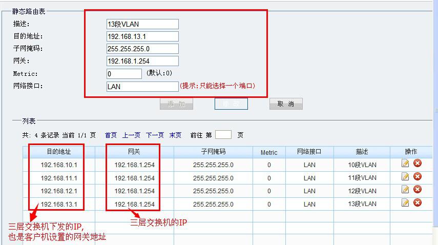 与路由器对接时,在维盟路由器“高级管理”-“静态路由表”做如下设置,其中Metric设置为默认的0即可,网络接口选择LAN。