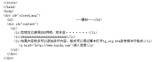下载通告模板,用记事本的方式打开,里面的内容可换成自己的宣传文字,例如