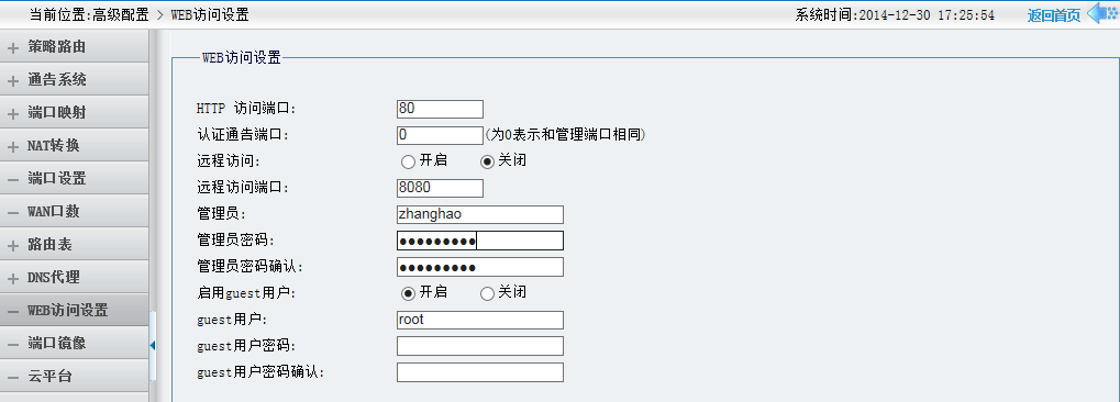 登录路由器界面之后,然后点击‘高级配置–WEB访问设置’处(如下图所示),可以查看到‘管理员’选项,即管理员登录路由器的账号。备注:账号和密码不建议使用特殊字符和汉字。由于是特殊字符&输入之后会变成其他未知字符。(账号和密码可以使用31位字符)
