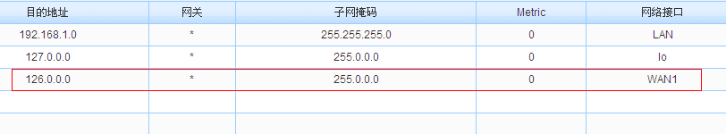 4、把广域网的掩码改正确,即设置为:255.255.255.252,路由表就恢复了正常,主机监控中126开头的IP就走到了广域网1,路由器下面的用户也能访问外网126.168.209.162服务器了。
