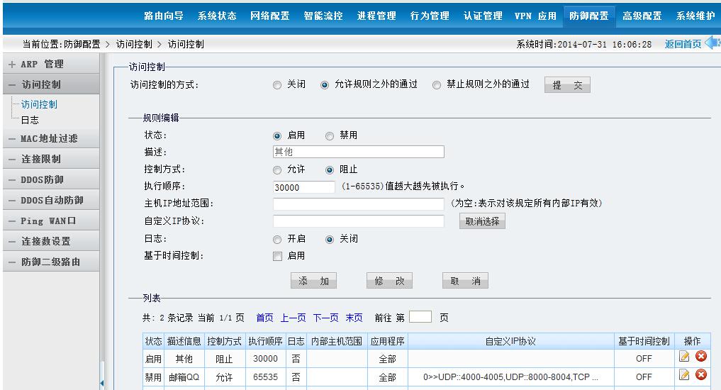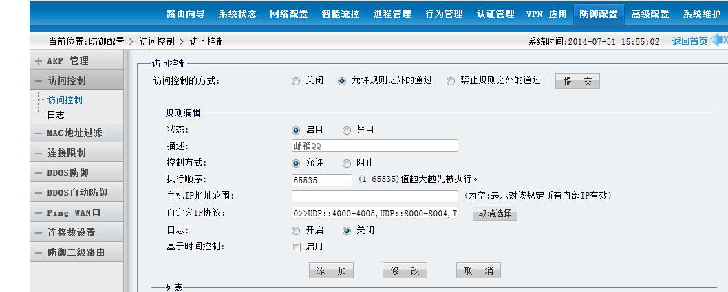 解决办法:在‘防御配置—访问控制’界面,添加用户只允许的QQ和邮件的端口号,然后阻止其他所有数据。