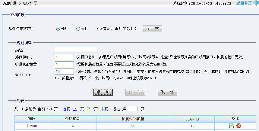此路由器默认有4个广域网,一个3G网络,3G口是广域网5。配置好之后可以在扩wan列表中看到哪一个广域网对应的VID为多少。