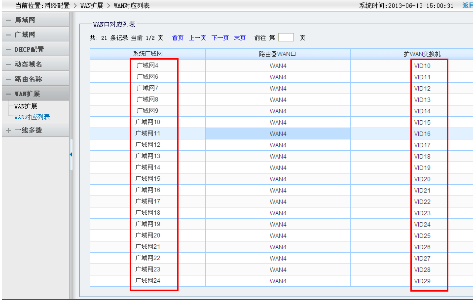 这里可以看到扩wan列表中总共有21条记录。广域网4为VID10,广域网6为VID10。