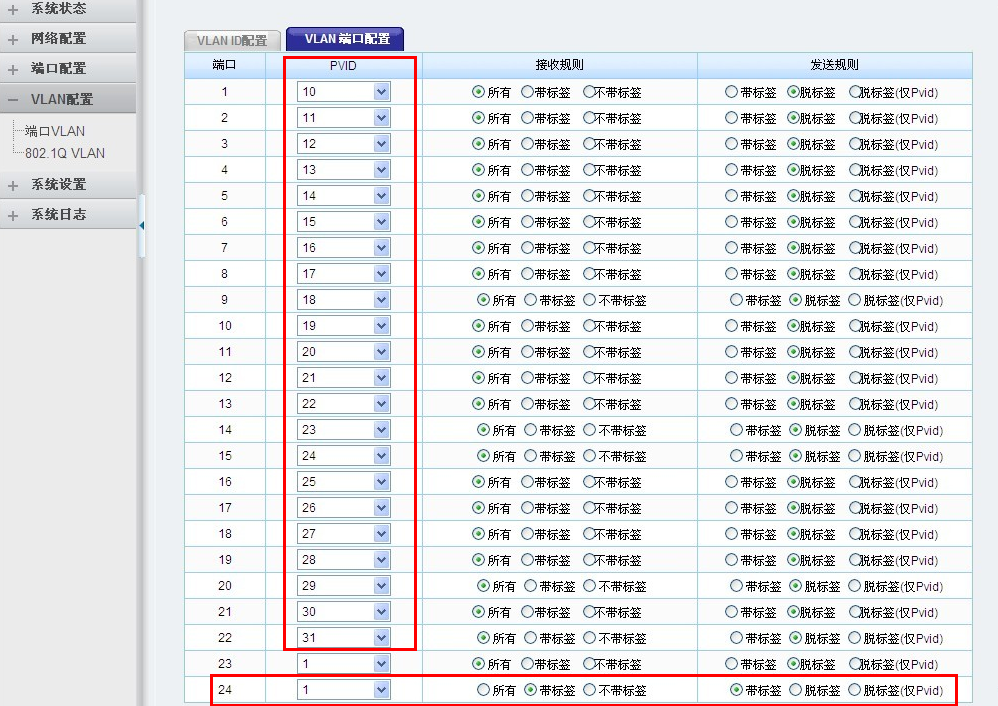 为vlan标记PVID,1为10,、2为11……其他接收规则和发送规则默认为所有和脱标签