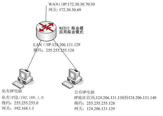 一位北京的电信通用户,使用WAYOS路由器作为网关设备,电信给出一段公有IP地址,范围是124.206.131.129/25到124.206.131.140/25,同时电信给出一个私有IP 地址是172.30.30.70/30,网关指向172.30.30.69/30,此用户内网有150多台计算机,电信提供的公有IP地址远远不够用,因此用户打算在内网一部分主机使用电信提供的公有IP地址,另一部分主机使用192.168.1.0/24网段。具体的网络拓扑及IP 规划如下图所示: