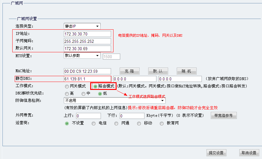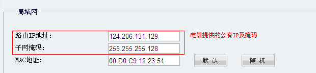和普通用户不同的是内网接口需要分配一个电信提供的公有IP 地址。