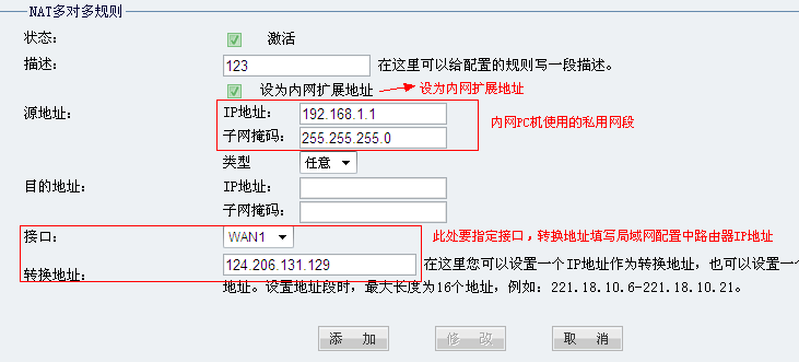要保证内网配有私用IP地址的计算机能够正常上外网,还需要在地址转换中添加相应规则才可实现,具体界面如下图: