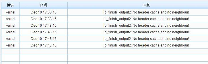 当路由器中的系统状态--日志中,显示‘ip-finish_output2:No header cache and no neighbour!’,如下图所示.